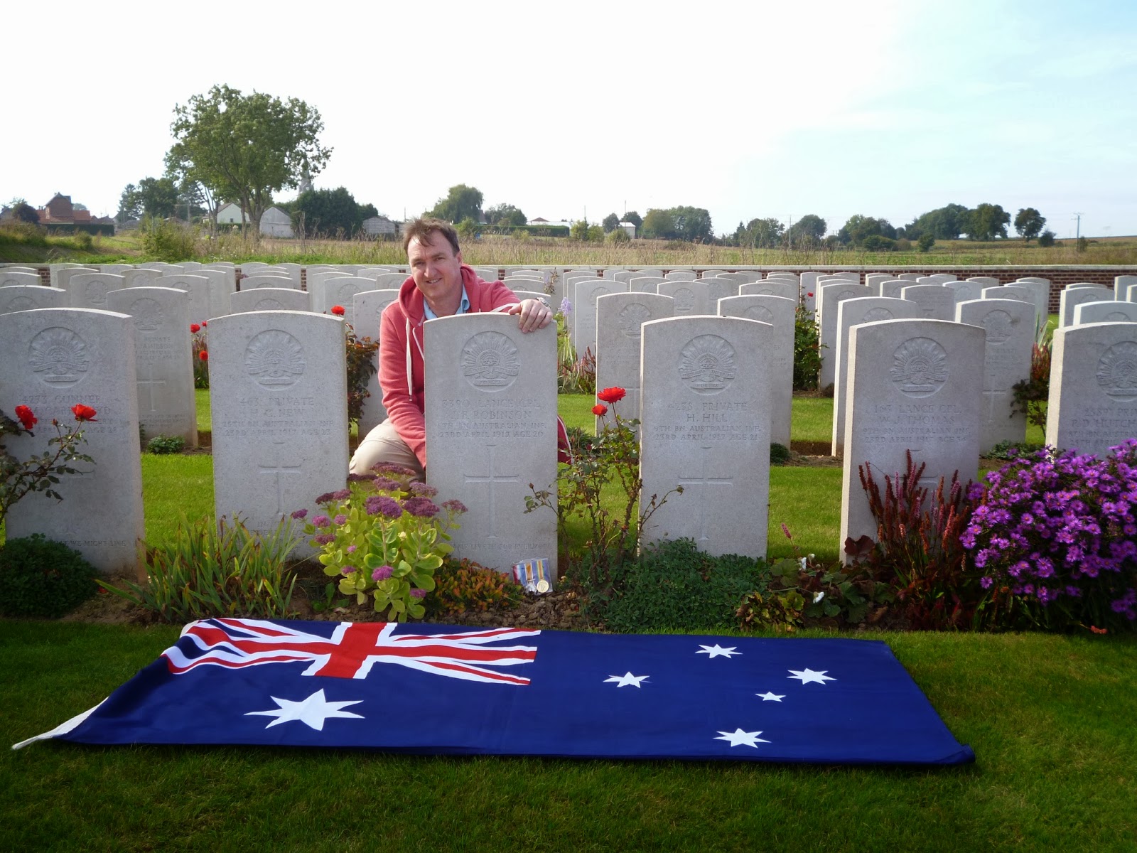 I rushed back to the car, much to Linda’s bewilderment, to retrieve my six-foot Australian flag. It has been to Gallipoli and been carried along the Kokoda Track. I needed it in Grevillers cemetery.